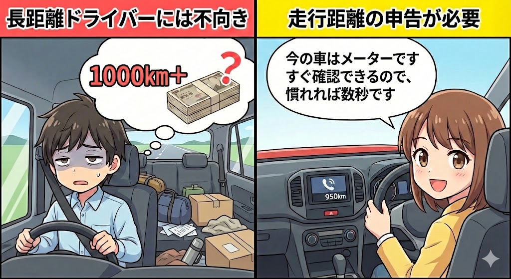 定期的に走行距離を確認する手間が発生します(今の車はメーターですぐ確認できるので、慣れれば数秒です)。