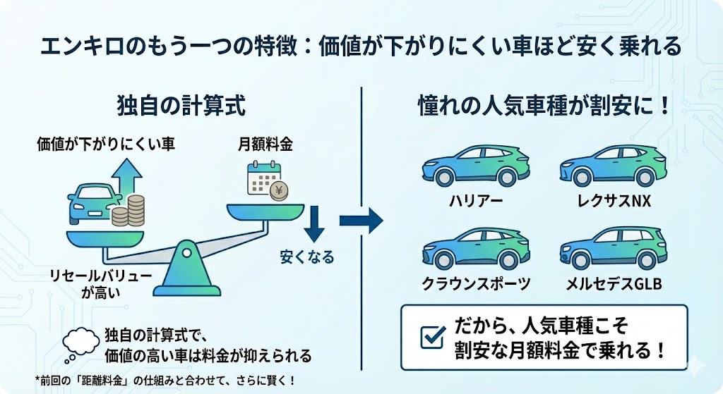 エンキロは「価値が下がりにくい車(リセールバリューが高い車)」ほど安く乗れる独自の計算式を採用しています。