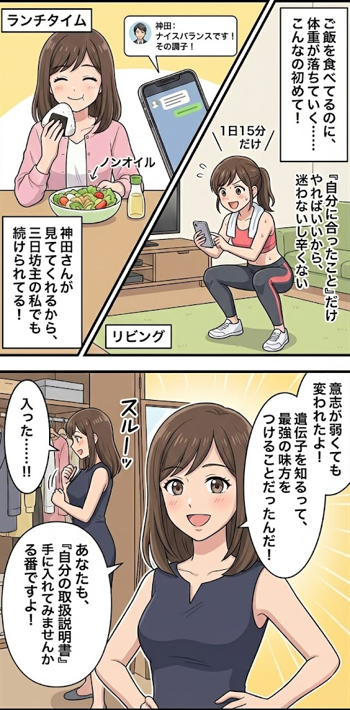 無理な制限ではなく、あなたの遺伝子タイプに合った「痩せる食べ方」を指導してくれます。