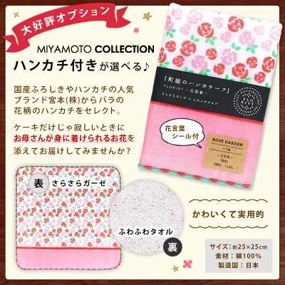 - 選べるハンカチセットも:形に残るプレゼントも添えたい方に。+550円でハンカチ付きも選べます!素敵な花柄で大好評のオプションです。